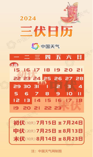 在大家的印象里“三伏天”一般是30天时间,但其实,“三伏”也有“加长版”的40天。“三伏”是按农历计算,每年夏至后的第三个庚日(干支纪日法中带“庚”的日子称为“庚日”)为“入伏”,立秋后的第二个庚日为“出伏”。“头伏”和“末伏”的长度是固定的,均为10天。“中伏”长度则由立秋节气与其后首个庚日之间的间隔决定,可能是10天,也可能是20天。今年“三伏”7月15日入伏,8月23日出伏,共计40天。